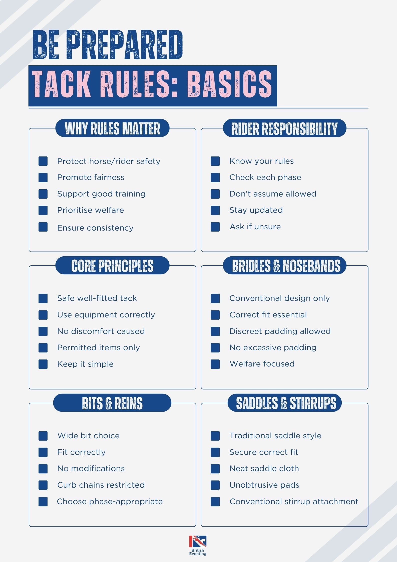 This checklist helps you check that your tack and equipment comply with British Eventing rules, clearly outlining what your horse can and cannot wear in competition.