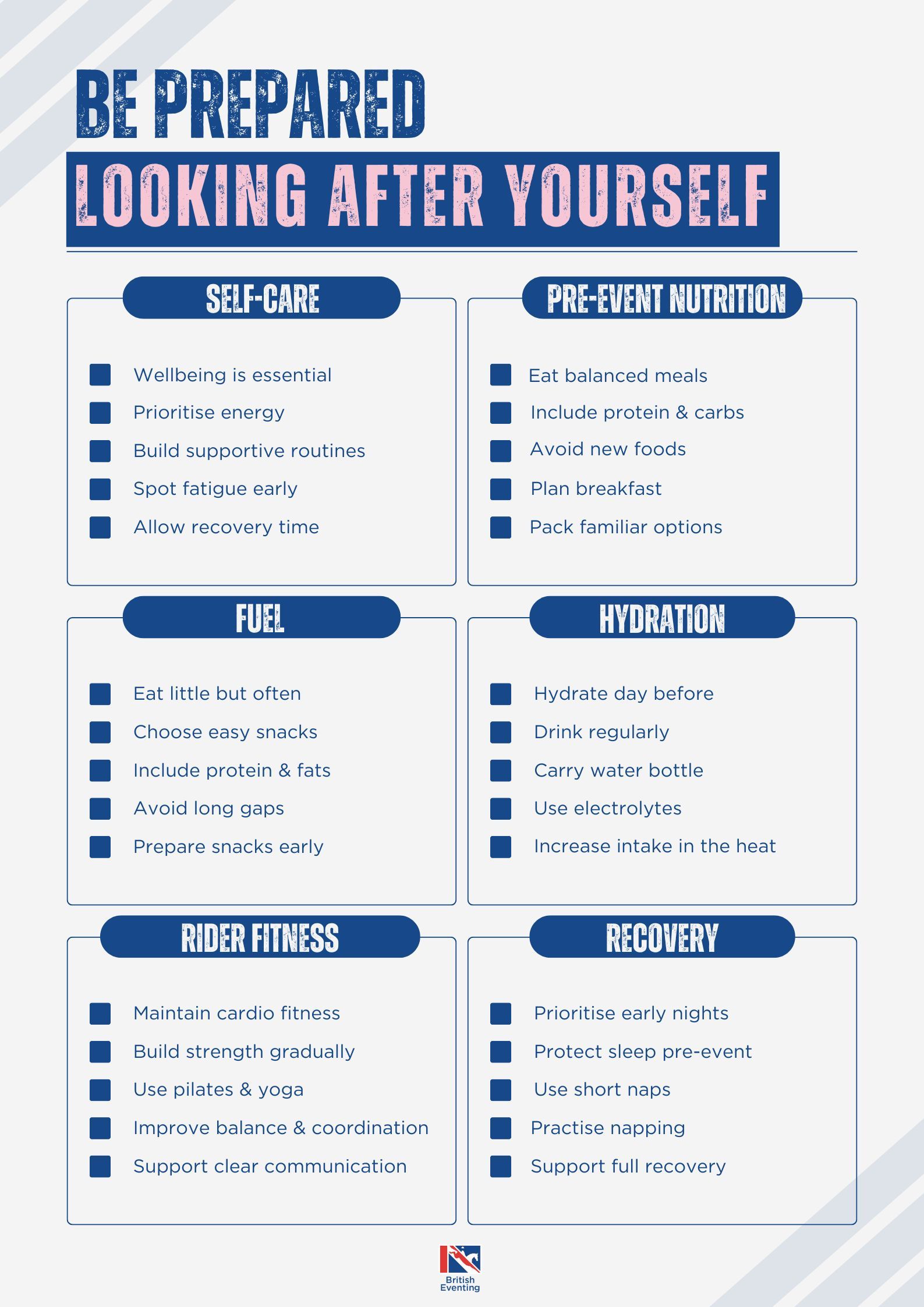 This checklist provides practical reminders to support rider wellbeing, covering nutrition, hydration, fitness and recovery.