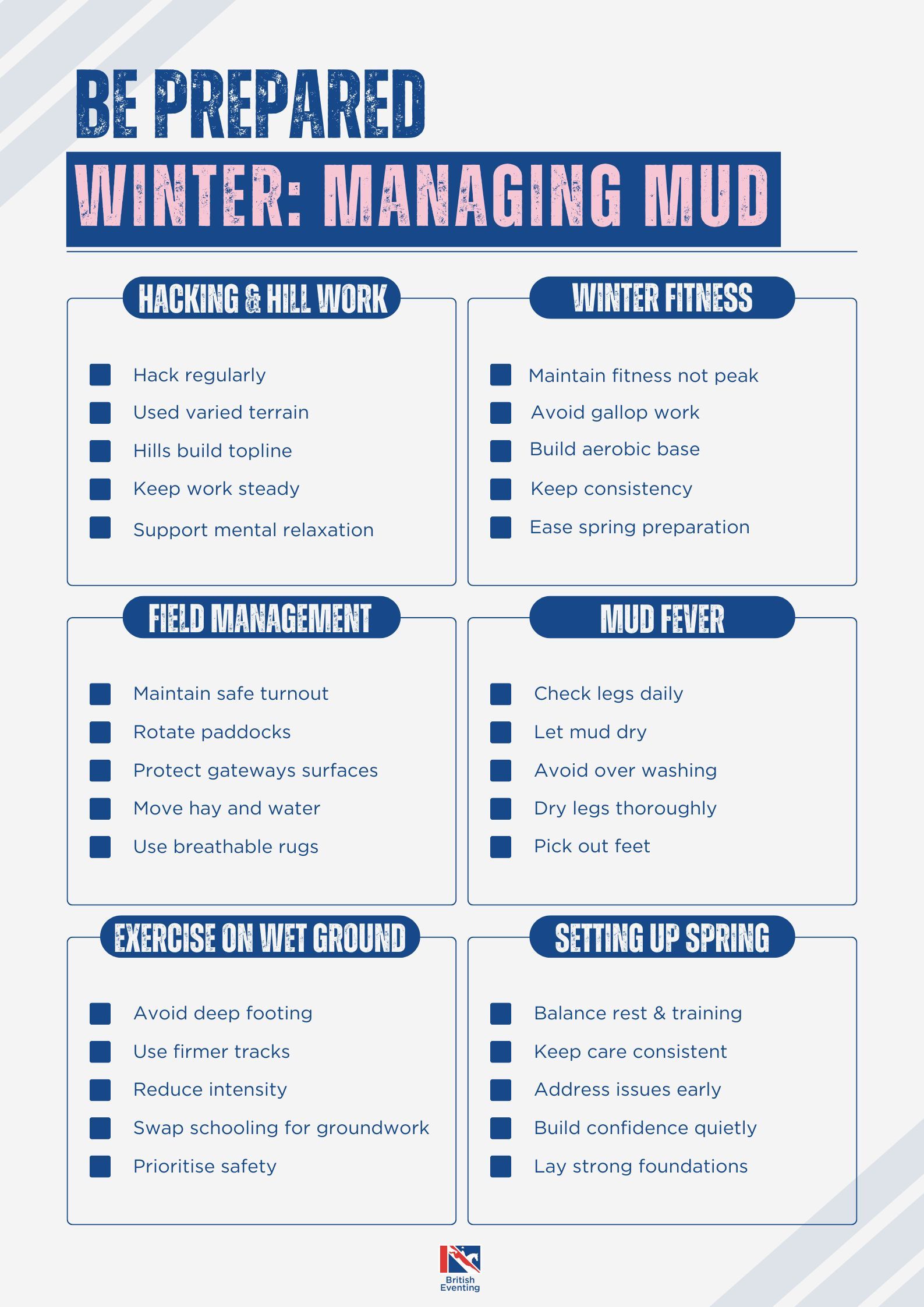 This checklist provides practical support for managing mud through the winter months, including field and turnout management, reducing the risk of mud fever, and adapting training to muddy ground.
